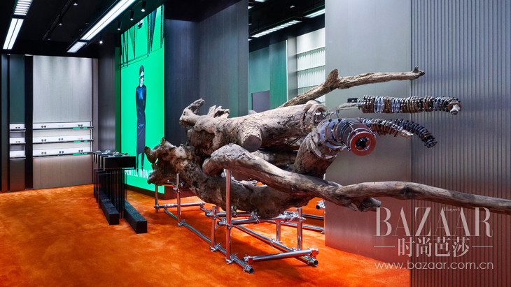 空间二层的装置是对于“THE REVOLUTION”主题的延续与完成。终于结束进化的植物群舞蹈着,为新的生命而举行着一场温柔庆典。在这种温和的美感和轻柔的紧张氛围交织中,来访者将真正体会到时间的能量与生命的张力。GENTLE MONSTER北京三里屯旗舰店通过一场关于植物进化的演示,邀请所有来访者思考并体验。