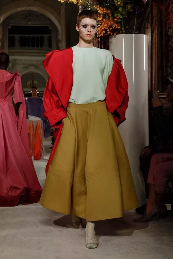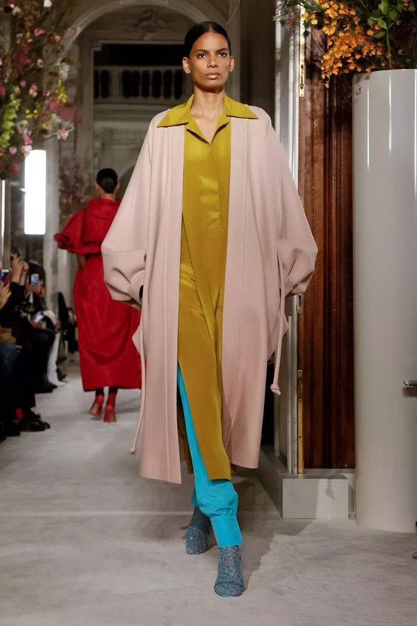 延续Valentino创意总监Pierpaolo Piccioli在近几季高定系列中呈现符合日常式着装的Look,简洁的线条设计增加了穿着时的舒适感,每个造型上对应三种截然不同的色系,体现了Pierpaolo Piccioli对色彩的高度敏感。