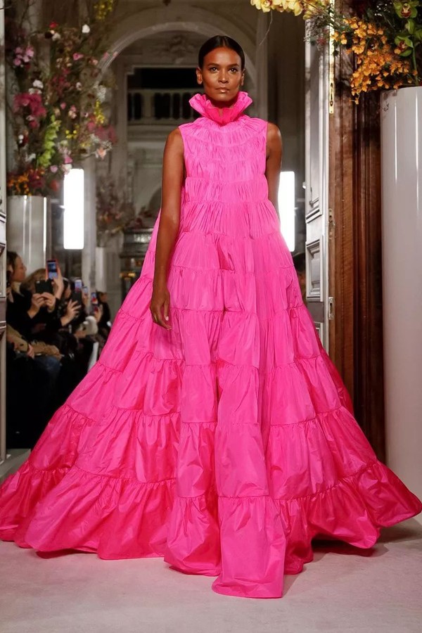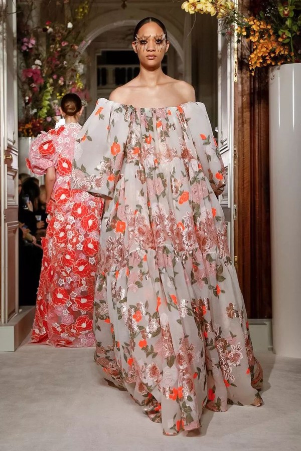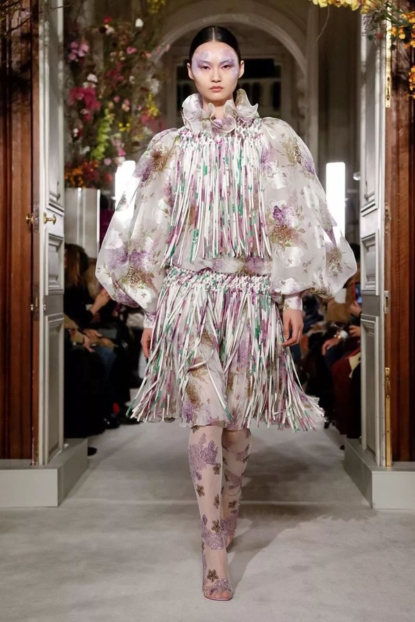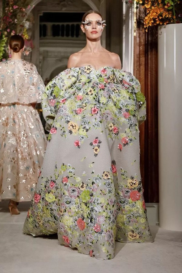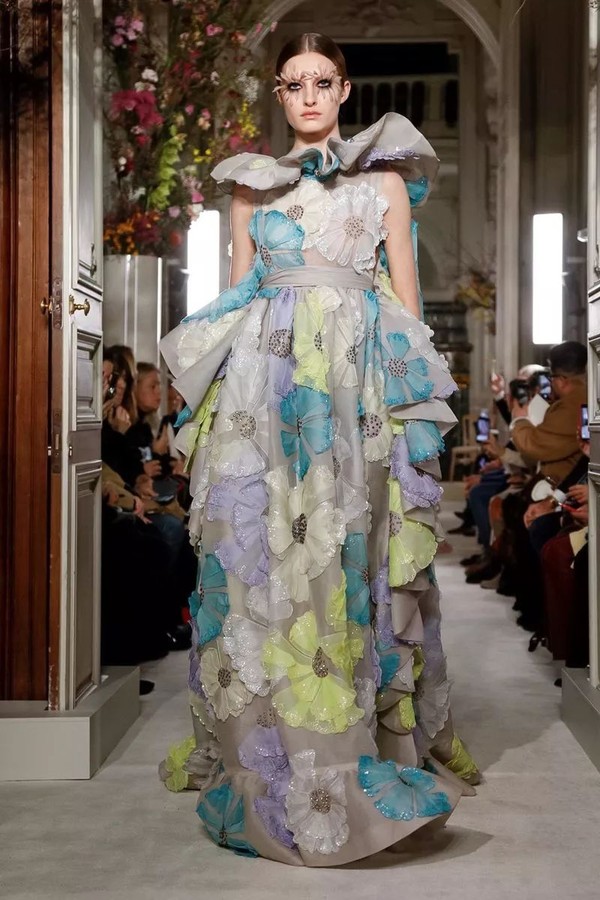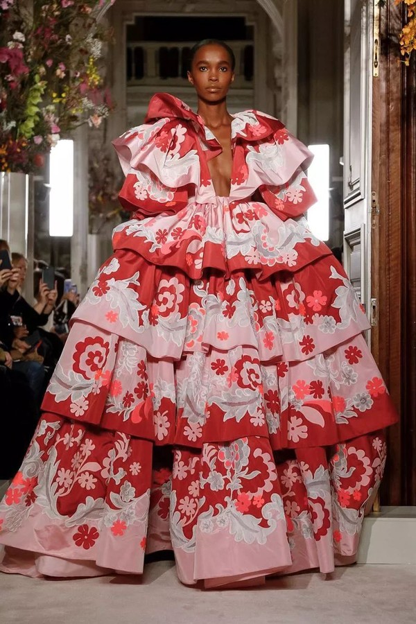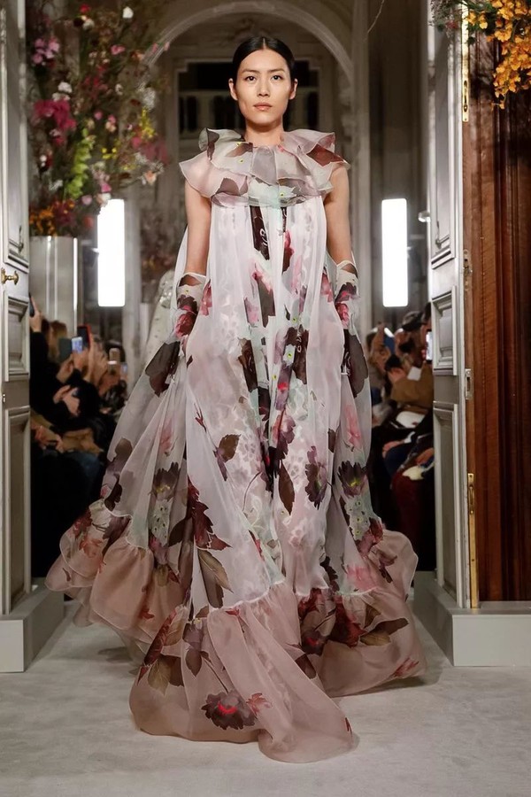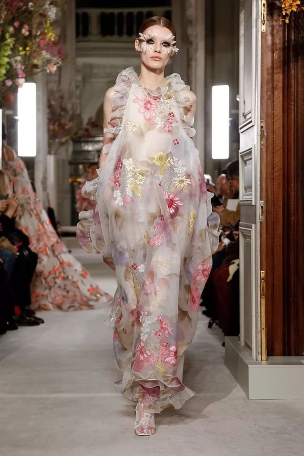 延续Valentino一贯的仙女风格,本季的高定裙装运用了大量质地轻盈的薄纱、丝绸,利用荷叶边的设计,使得整体搭配充满流动的美感,随着模特的步伐薄纱上下飘动,像极了花园中飞落的花瓣。