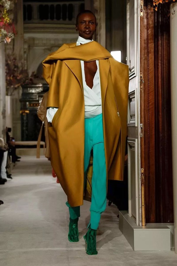 廓形风衣选用亮面材质,增加光泽度,运用白色平衡了棕色与薄荷绿之间较大的色调差异。