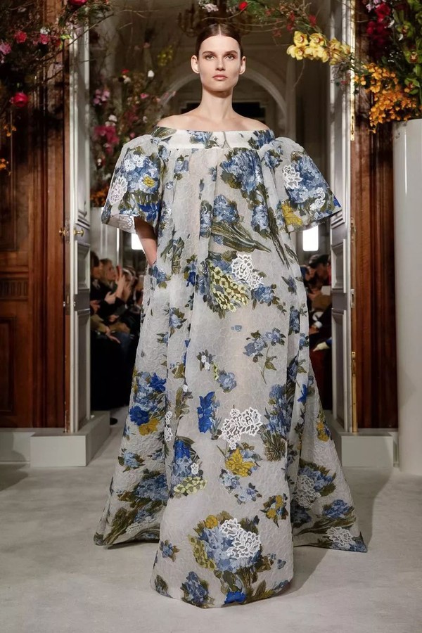 一字肩是Valentino最经典的造型之一,自然垂落的超大裙摆拉长身体比例,搭配泡泡袖,复刻欧洲宫廷服饰的精髓。