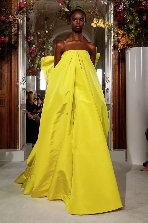 随着音乐高潮部分的过去,繁花散尽,夜晚也渐渐接近尾声。特殊的轻薄布料让荧光粉也能变得高贵优雅,明黄色采用简单的一字领设计,后背的蝴蝶结装饰使得整体造型简单又不失独特。