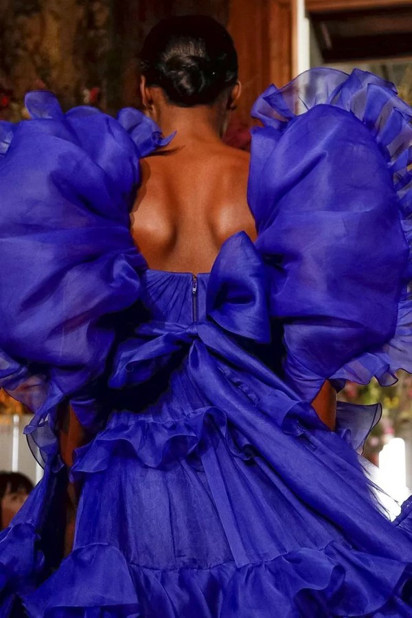 浪漫的荷叶边结合稍显厚实的布料也能和谐“共处”,深V领的剪裁露出女性性感的锁骨和胸线,如同宫廷礼服的超大廓形也让模特尽显优雅。