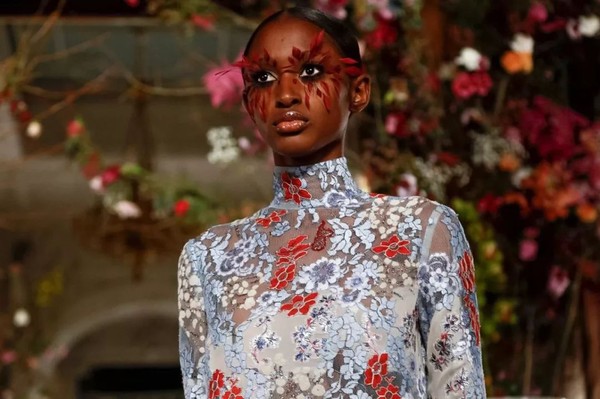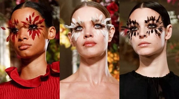 模特的眼妆契合这座繁花似锦的花园秘境,珠光材质的花卉妆容在夜幕下更加流光溢彩,使用不同色调的羽毛制作的夸张睫毛忽闪忽闪,有着如精灵一般的俏皮灵性,透过她们的一双双灵动的眼眸,我们似乎也能感受到这座在夜晚才开放的神秘花园里的纯净与美妙。