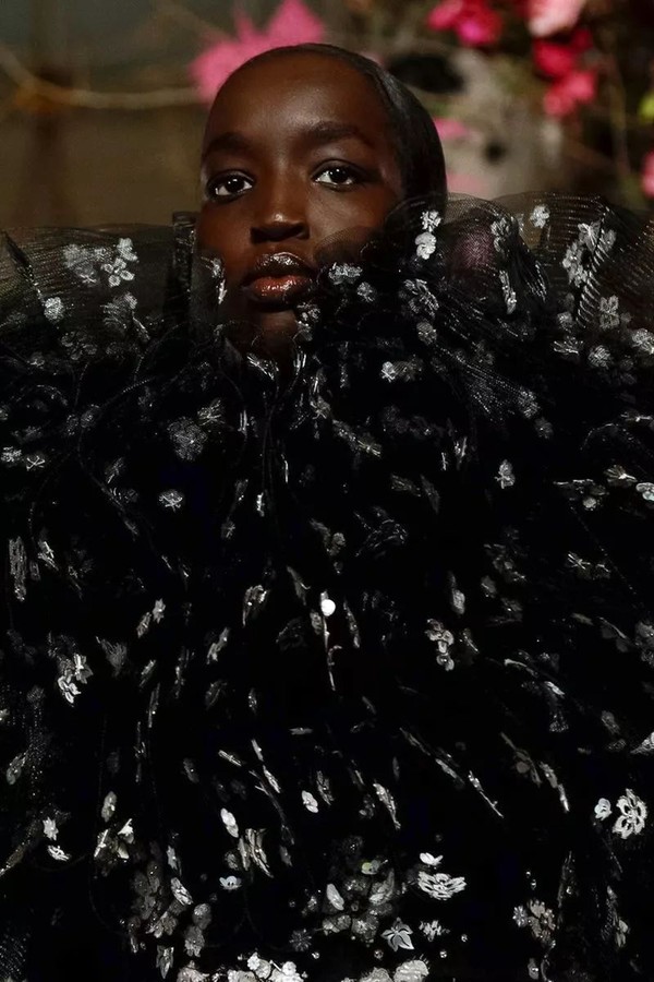 身穿一袭黑色礼服的Naomi Campbell走在黑夜尽头直至消失,只留下带着花瓣的足迹,一场充满美好的梦终会醒来。上半身轻透简单的黑纱和下半身充满褶皱的蛋糕裙形成鲜明对比,仿佛梦中所有的美好景色都随着她的走动被藏在了无尽的黑夜中。