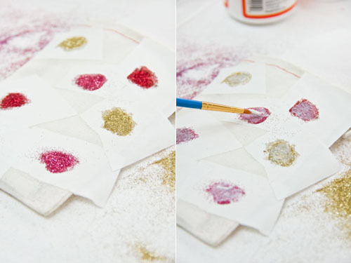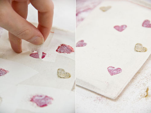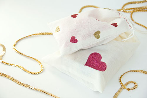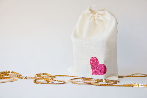在纸条上压出桃心形状,将有桃心镂空形状的纸条放在收纳袋上,在桃心形状上涂抹胶水,最后撒上一些亮粉,等到亮粉固定好后,将纸条拿开,就完工啦!