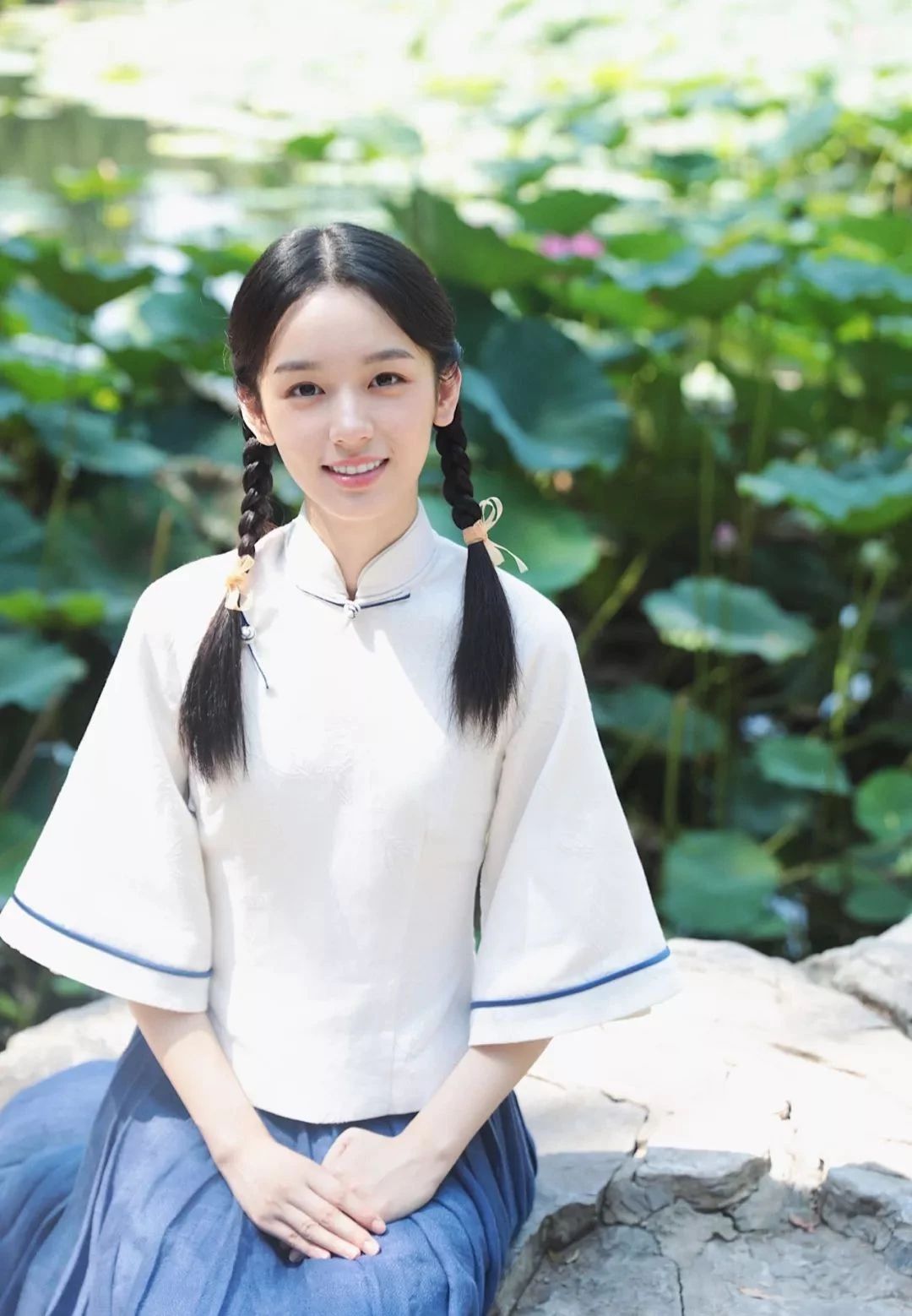 一身民国的装扮,扎起双麻花辫,笑起来就像月牙一般的眼睛,将少女的恬静温柔展现得淋漓尽致。