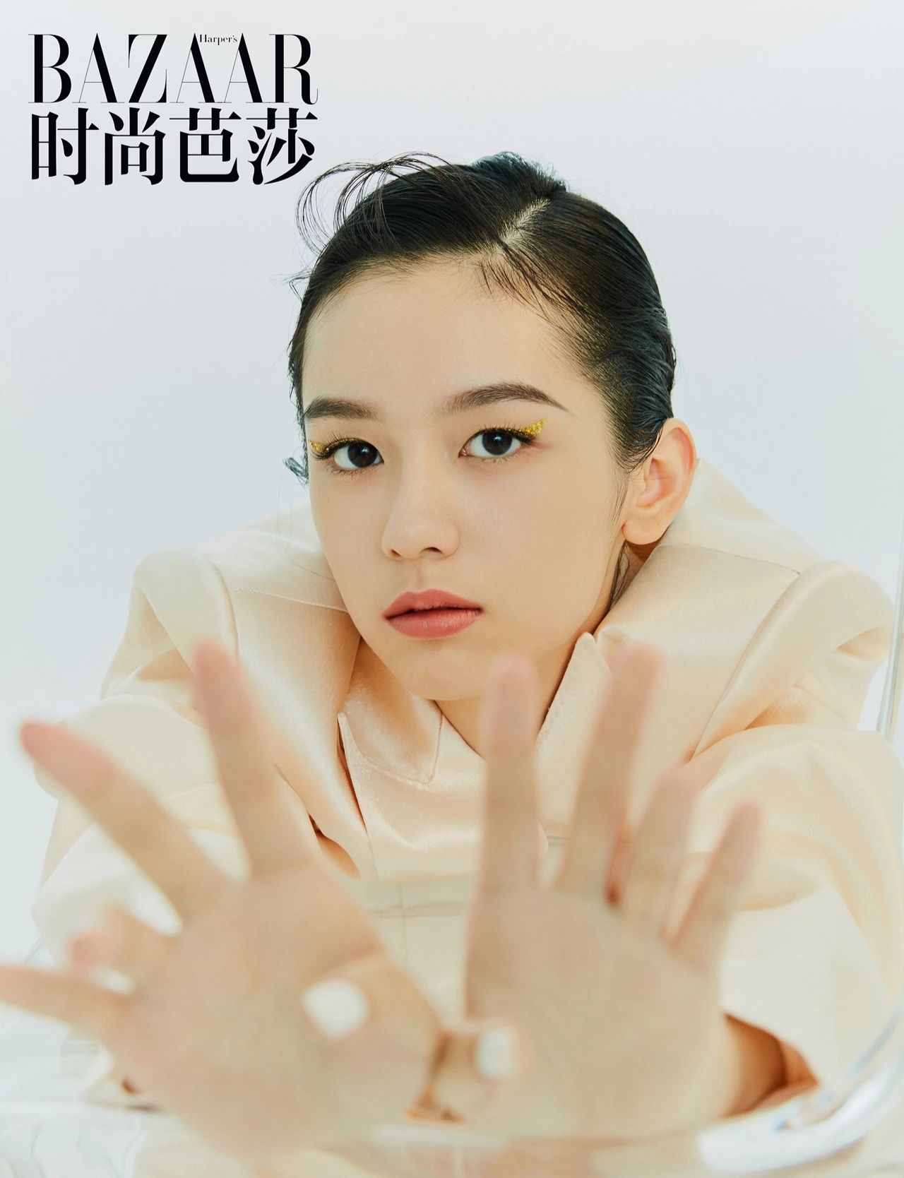 长发飘飘的周也,嫩到可以掐出水来,眼神中透露着对世界的好奇心,穿上白色花边衬衫,如同绽放的花朵一般清甜。