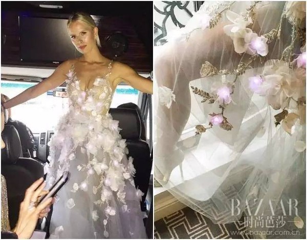 芭姐认为,真正切合今年Met Gala主题“手工X机械:科技时代的时尚”还是Karolina Kurkova的LED裙。乍看之下好像就是用led灯缝制的花朵,大家觉得这种开灯亮起来的效果,还是没有Claire来得梦幻。