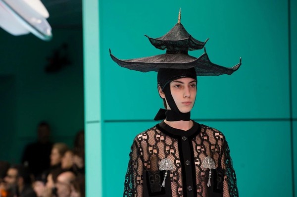 Gucci 2018年秋冬系列中的帽饰设计有强烈的中国建筑风格