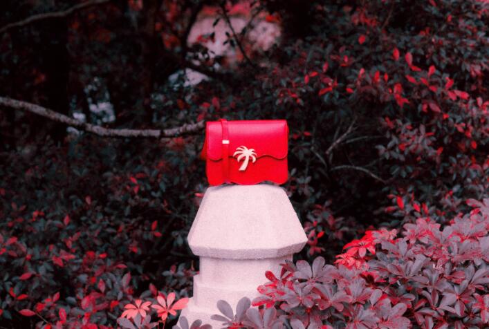 • 饰有红色皮手把、金色棕榈树装饰的黑色麂皮托特包袋 • 饰有金色棕榈树纽扣的红色方形皮革斜挎包