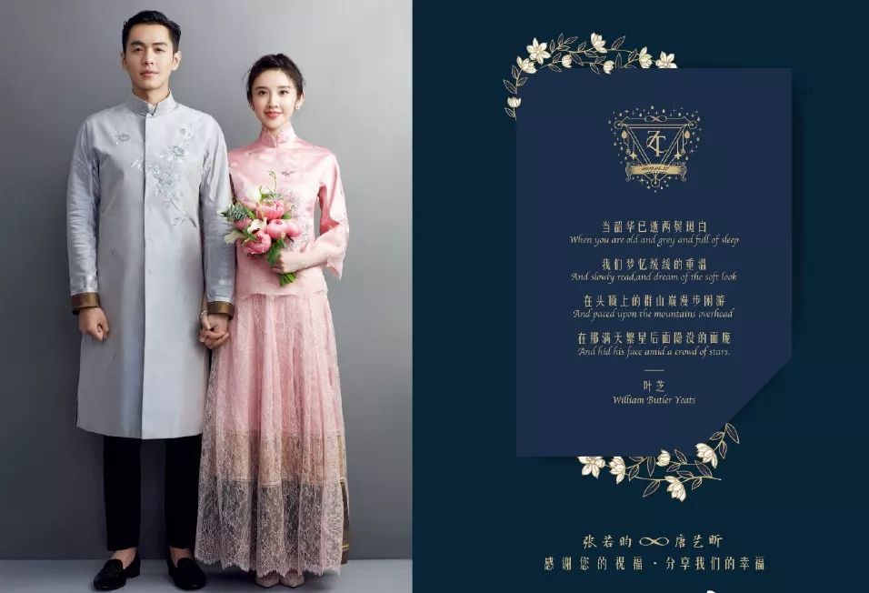 2019年举办婚礼,给宾客的伴手礼礼盒中,张若昀用了威廉·巴特勒·叶芝的经典爱情诗篇,“当韶华已逝两鬓斑白/我们梦忆缓缓的重温/在头顶上的群山巅漫步闲游/在那满天繁星后面隐没的面庞”,不能更浪漫。