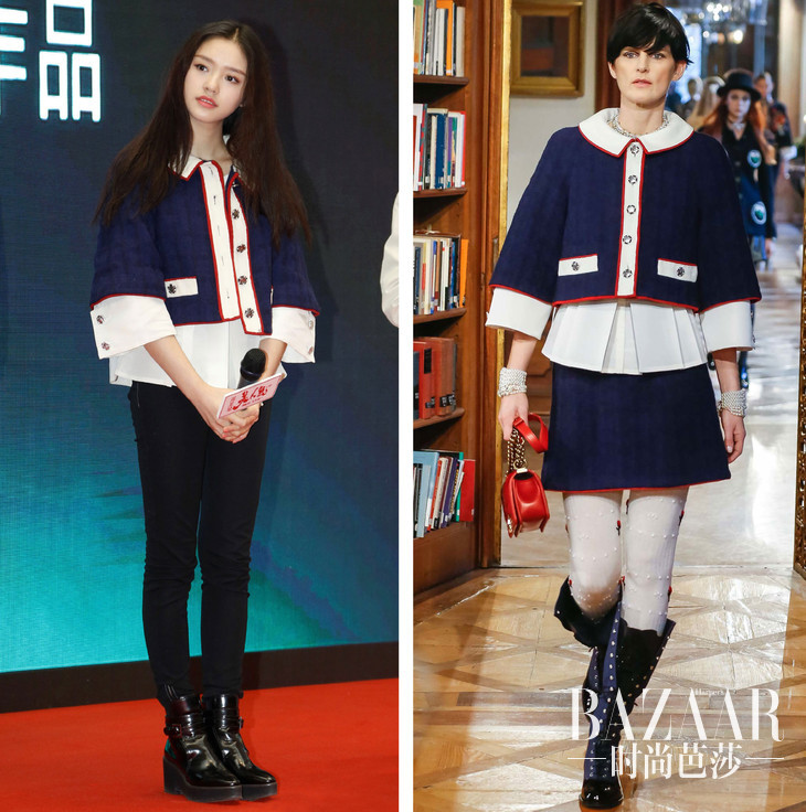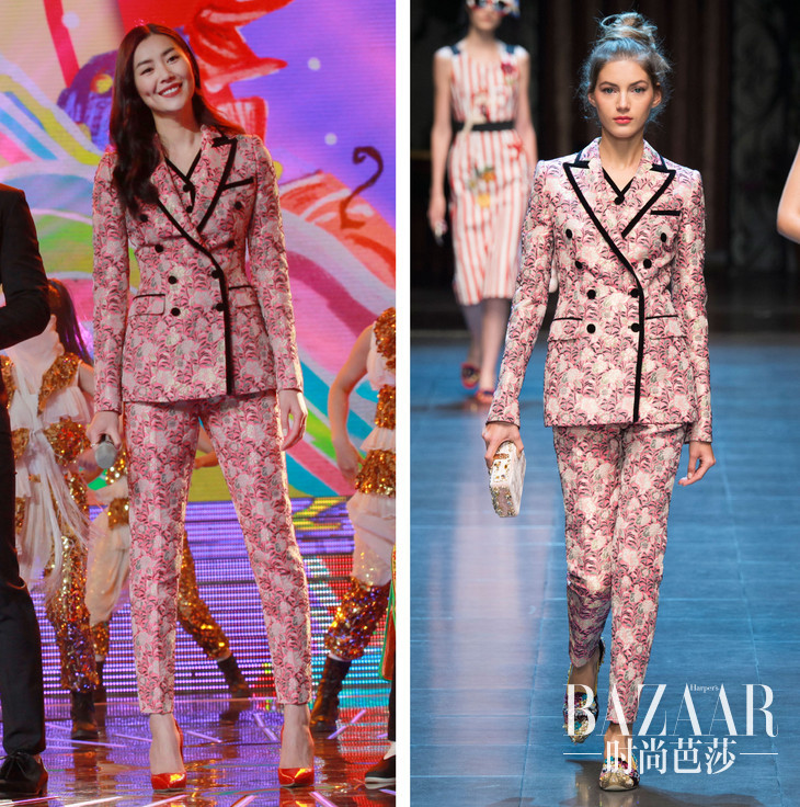 本周二刘雯亮相湖南卫视小年夜。粉色印花西装套装帅气又不失柔美,红色高跟鞋也搭配的相得益彰,两条定海神针般的长腿笔直得让人羡慕。全身上下找不出一点毛病,过年要是像大表姐这么穿,绝对让你红包收到手软!