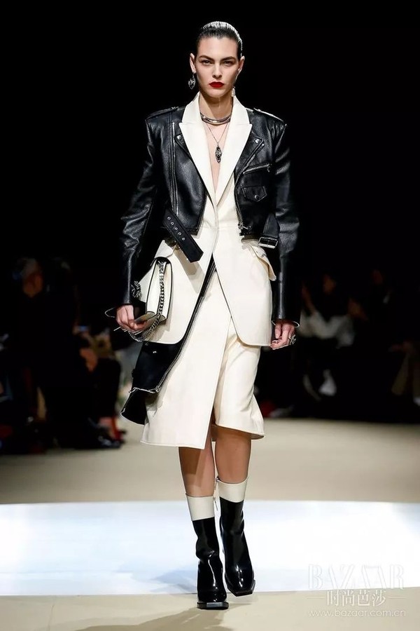 撇去西装套装,纯皮衣套装酷劲加倍。Alexander McQueen 2018 秀场上这套皮衣套装,在帅气中融入荷叶边的少女气息,风格多元,时髦轻松 Get。