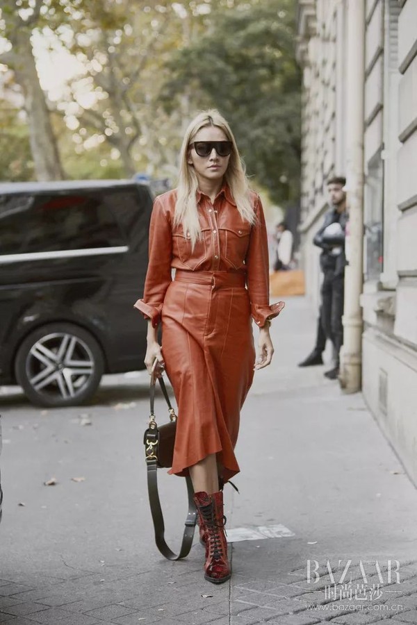 也不一定要那么 Drama 的皮衣套装才摩登时髦,像Isabel Marant 这种简单利落的皮衣套装也足够帅气优雅。简单的衬衫,略带设计感的包臀裙,不过分的精致时髦。