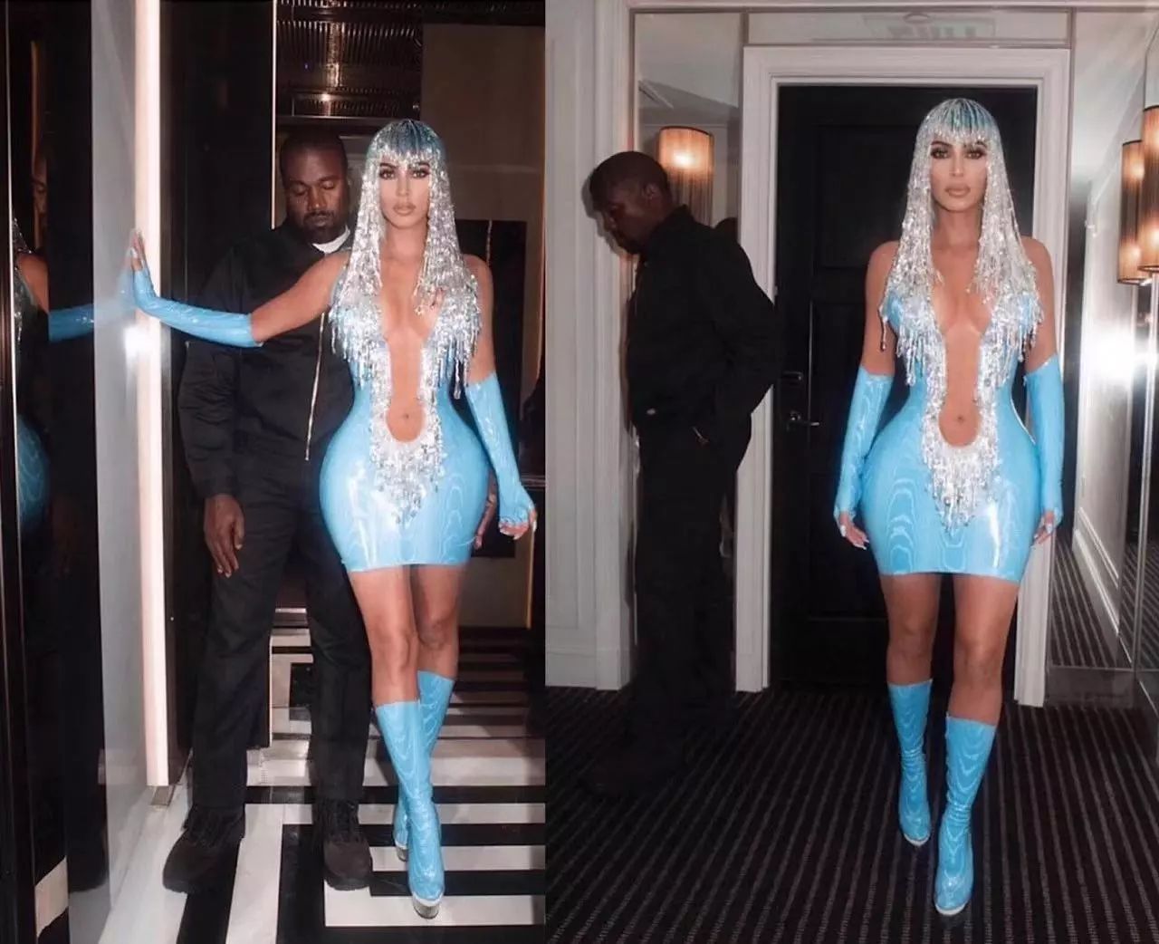 Kim当晚一身“湿身装”亮相,有种出落水面的感觉,身着Thierry Mugler设计的礼服。为了穿上这件难以置信的紧身胸衣,Kim进行了大量的锻炼和禅修。