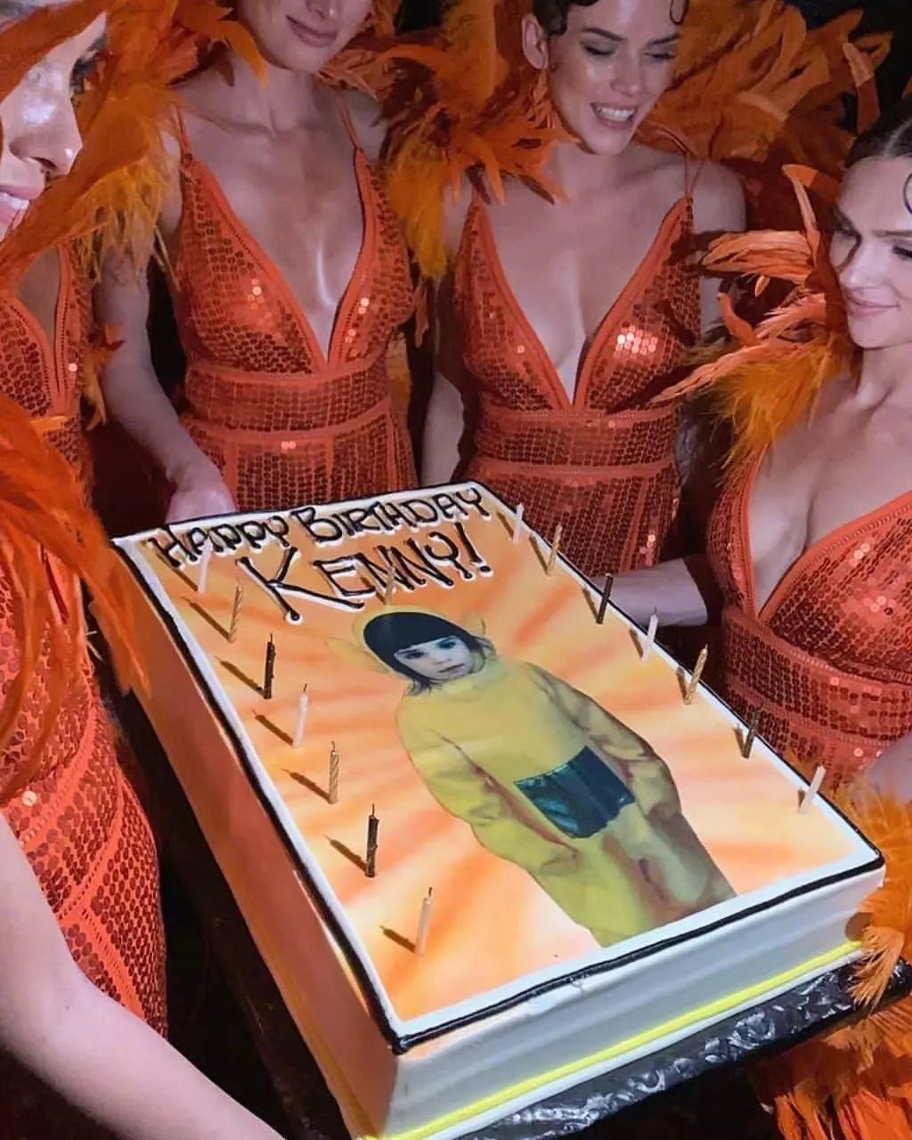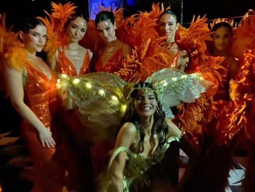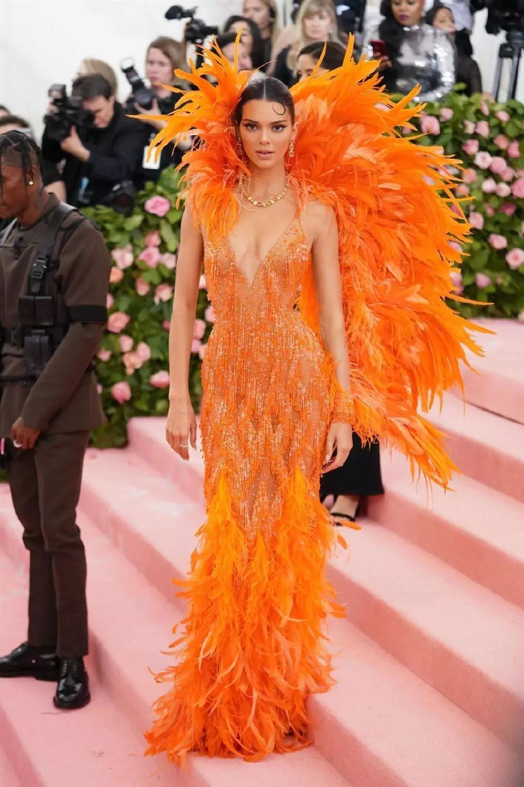 Kendall就顺利很多,橙色系装扮,肩膀处采用大块羽毛装饰,裙子也是性感的吊带羽毛裙,作为她们家的清流,真是“胸以下全是腿”。