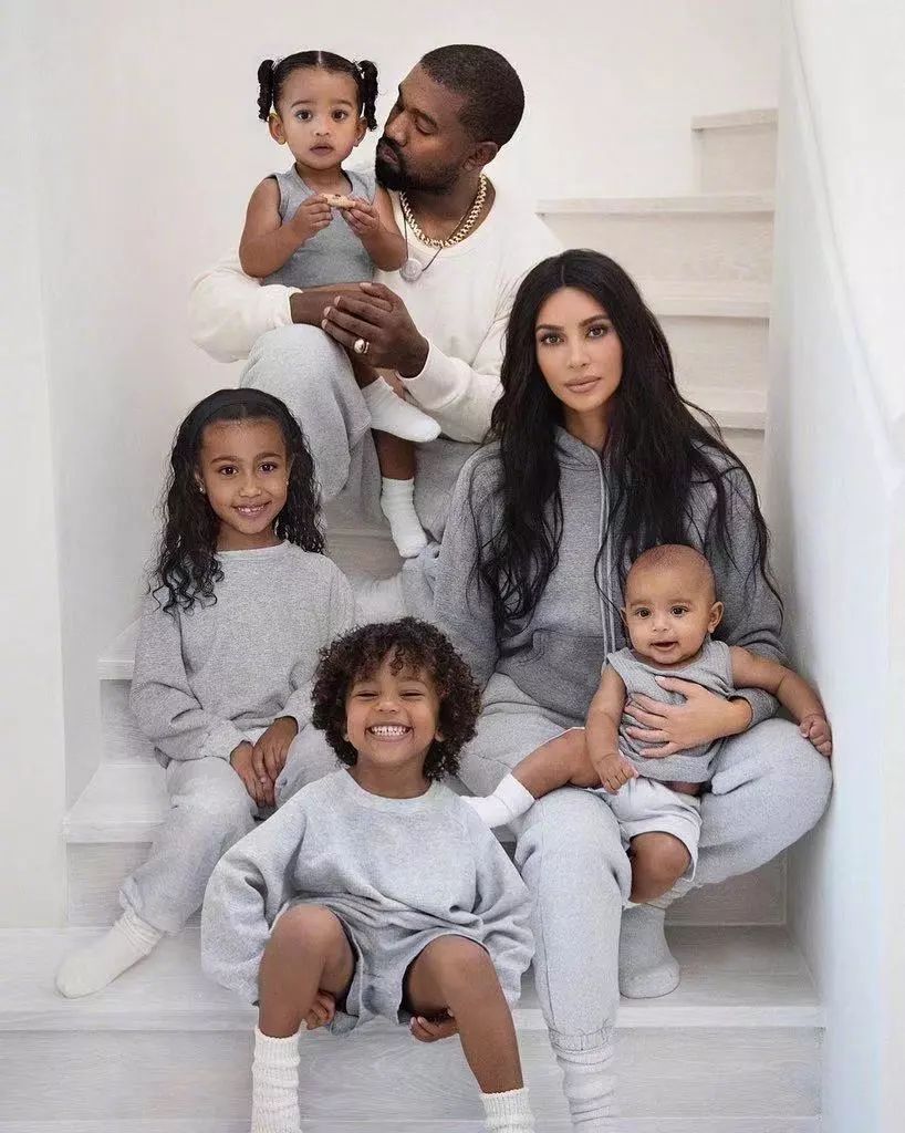 今年率先发布的是Kim一家6口的全家福,金姐一改往常性感霸气风格,全家都换上了家居服,灰白色调看起来很舒服。