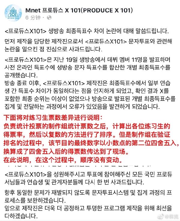 面对粉丝的“票数造假”质疑,7月22日时(决赛后3天),节目主办方Mnet还坚持强硬态度不妥协,发表声明强调就是巧合、投票没有造假