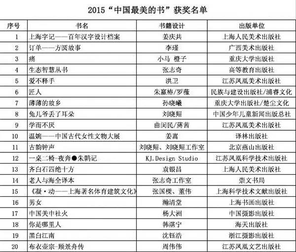 2015年度“中国最美的书”评选于11月9日揭晓,来自全国各地18家出版社的20种图书荣膺本年度“中国最美的书”称号,并将代表中国参加2016年度的“世界最美的书”评选。自2003年以来,先后有12批251种“中国最美的书”亮相德国莱比锡,其中13种图书荣获了“世界最美的书”称号。