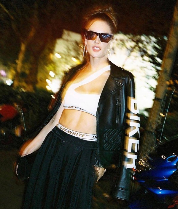 超模大AA用swim top配上黑色机车夹克和阔腿裤,马甲线隐约可见,再加上一副墨镜,女王气场全开。