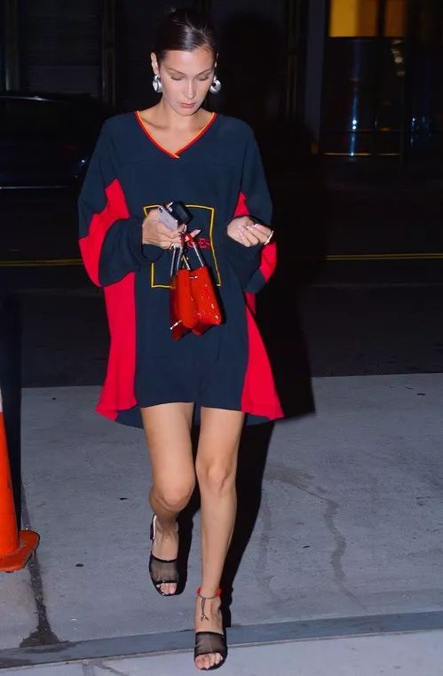 将毛衣裙换成宽松的剪裁,拼色的设计带着街头气息,再搭配一双黑色中跟鞋和一对惹眼的耳环,俨然一幅酷帅的街头少女模样。