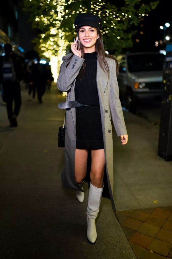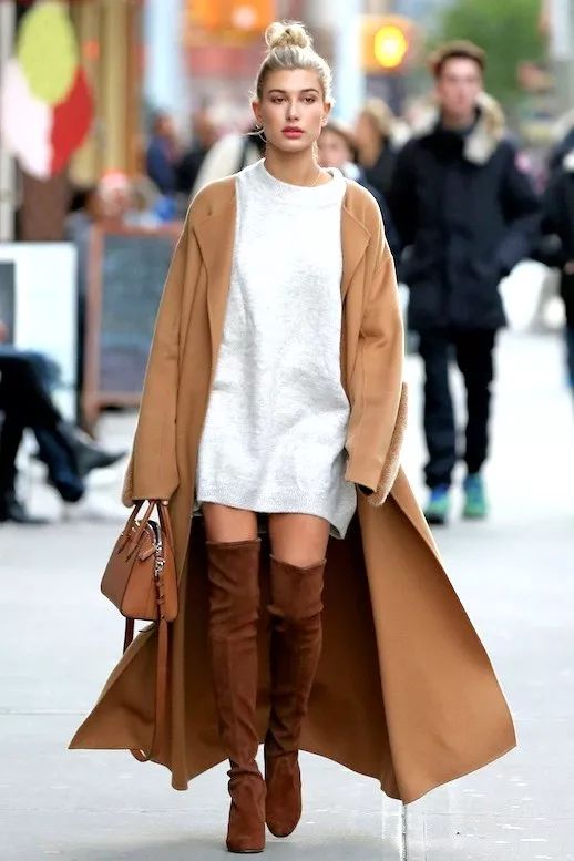 对于短款毛衣裙来说,有一个不易出错的搭配公式便是“毛衣裙+过膝靴”这个组合,冬日里的保暖效果不必多说,黑色过膝靴相比光腿还能在视觉上让腿部更加细长,像Hailey一样外搭一件长款大衣就能气场全开。