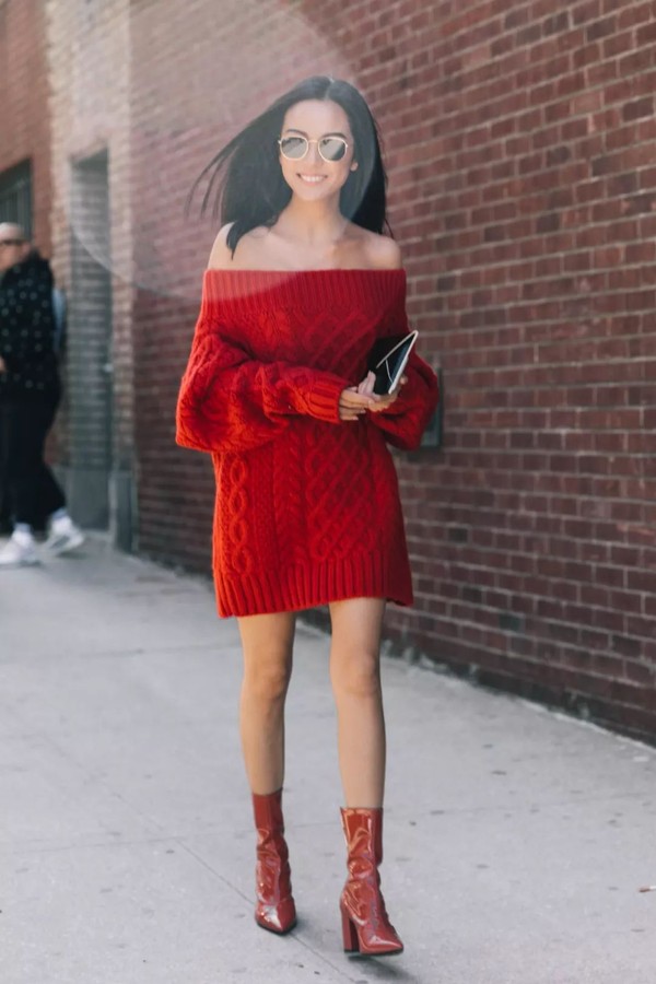 但时尚博主们也为大家提供了搭配新思路:挖肩款式的毛衣裙。相较于一字肩毛衣裙,挖肩款式的毛衣裙不会轻易暴露出脖子的缺陷,同时也为造型蒙上了一层神秘优雅的风情。