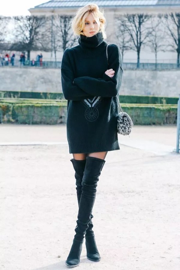 作为毛衣裙的忠实拥趸,Bella的毛衣裙搭配常常能给大家提供不少搭配思路。同样用纯色毛衣裙搭配长靴,黑色过膝靴则用日常感代替了蛇纹长靴的浮夸气息,而修身剪裁的毛衣裙则让Bella的好身材一览无余,性感又优雅,而这样的搭配也更适合女生日常效仿。