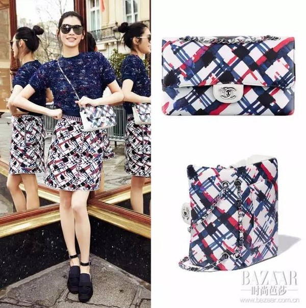奚梦瑶最近拍写真分分钟秒杀菲林,针织T恤是长颈细腰的仙女才能驾驭得了的,红蓝交织的几何印花半身裙和同花色的手袋融为一体,般配得毫不眼花缭乱。这只Chanel春夏款的链条包,芭姐真的认为可以从春天一直背到冬天。
