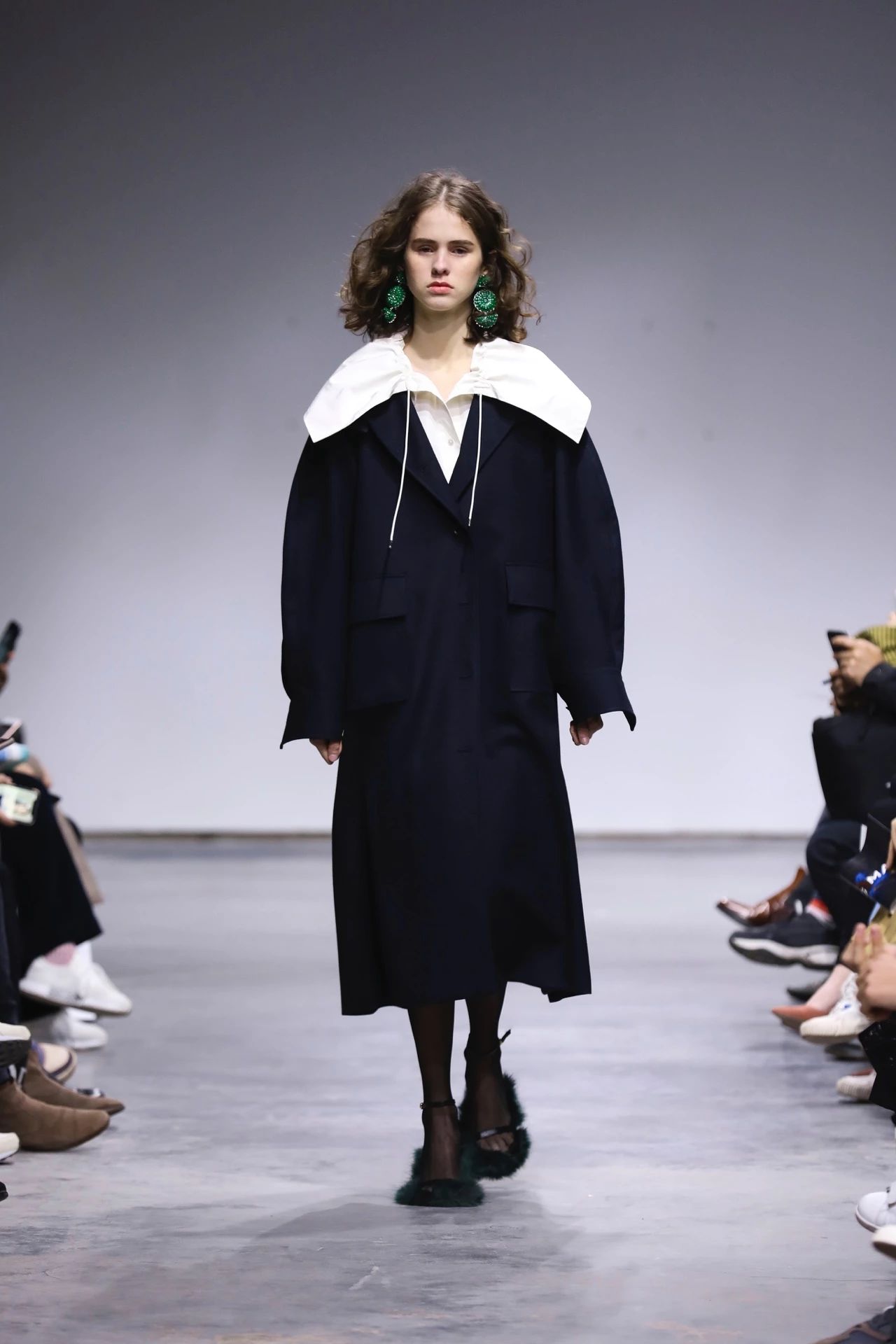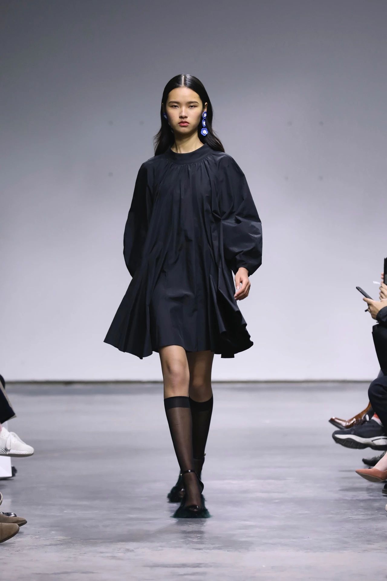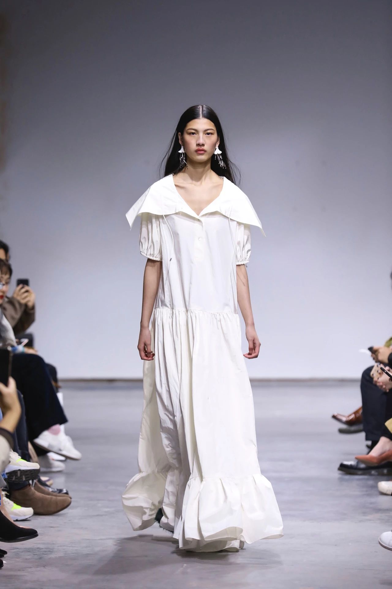 2019秋冬系列里,Ming Ma把20世纪初期奥地利时装设计师Emelie Flöge的罩式长袍和画家常玉的作品作为灵感,搭配现代感的剪裁让廓形更加简约,肩袖和下身裙摆增加褶皱细节也让裙装充满了体积感。高级定制礼服的剪影贯穿全场,除了借鉴常玉绘画中明亮的大色块的视觉演绎,她笔下女性圆润的曲线和夸张扭曲的比例也是本季廓形线条的重要灵感之一。