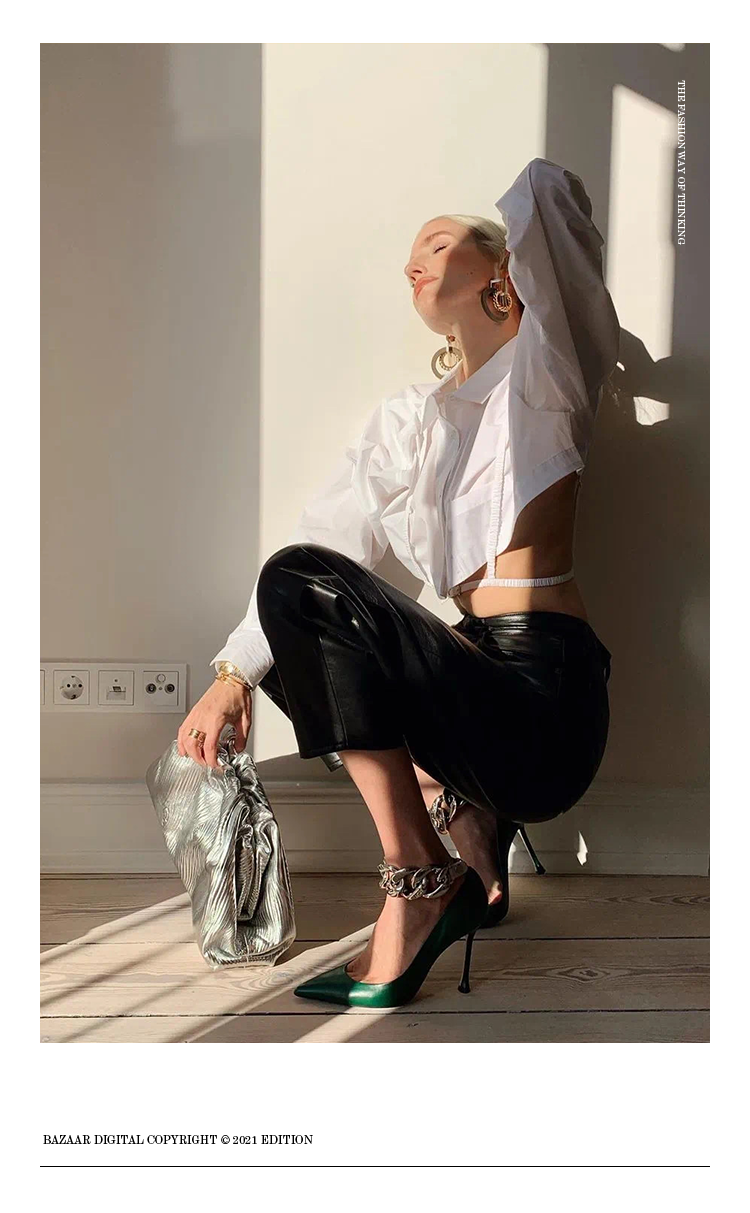 继之前大金链子的爆火,金属元素又开始对鞋子下手了,再简单的小黑裙,只要穿上一双带有金属脚链的高跟鞋搭上其他配饰,从头到脚都在发光就不是梦。