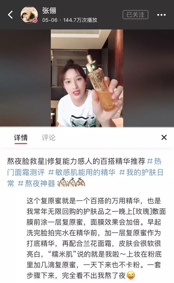她在熬夜的情况下会在睡觉前选择厚敷在脸上,当面膜使用,早起后皮肤状态就会好很多~