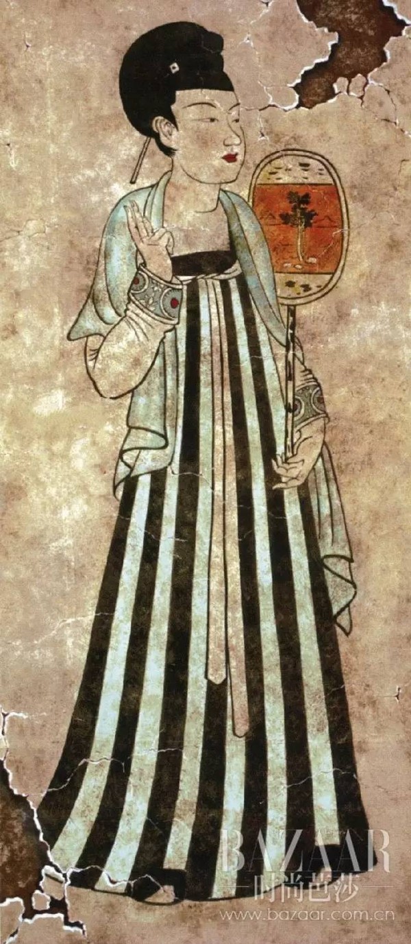 段简壁墓壁画,穿条纹裙子,头戴假髻的女子
