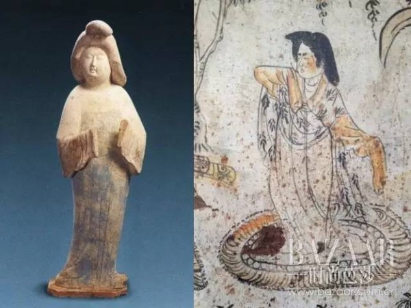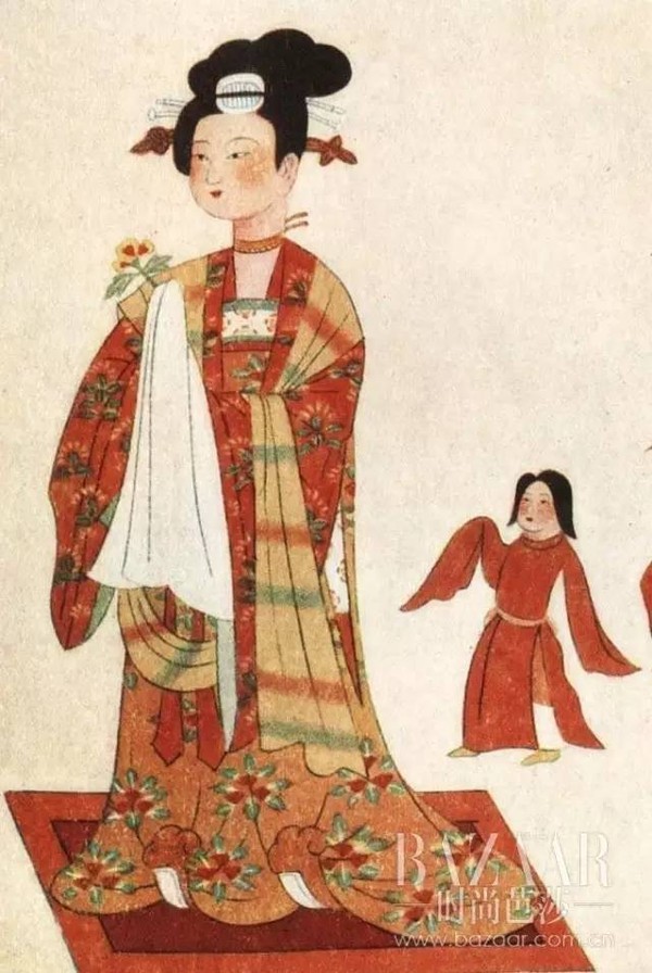 阿斯塔那出土唐初戴假髻(环髻),披披制的女子塑像到了唐高宗后期和武则天时代,上衣较之过去变长,服饰的整个轮廓显得非常苗条。不过武则天时代的一个现象是,女性衣饰的领口显得很低,那是一个女性最不吝于袒露胸线的时期。
