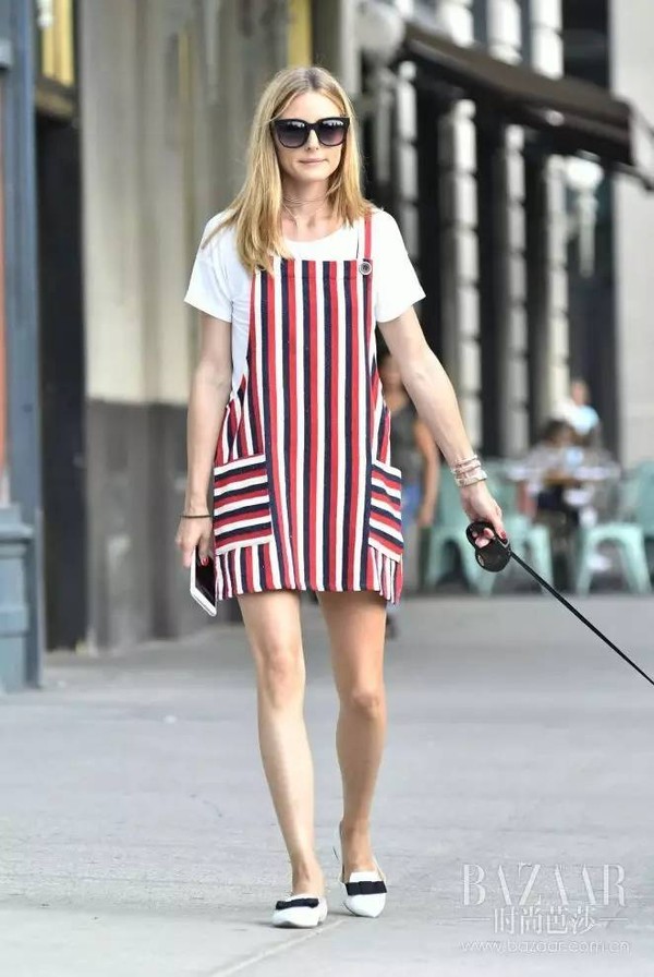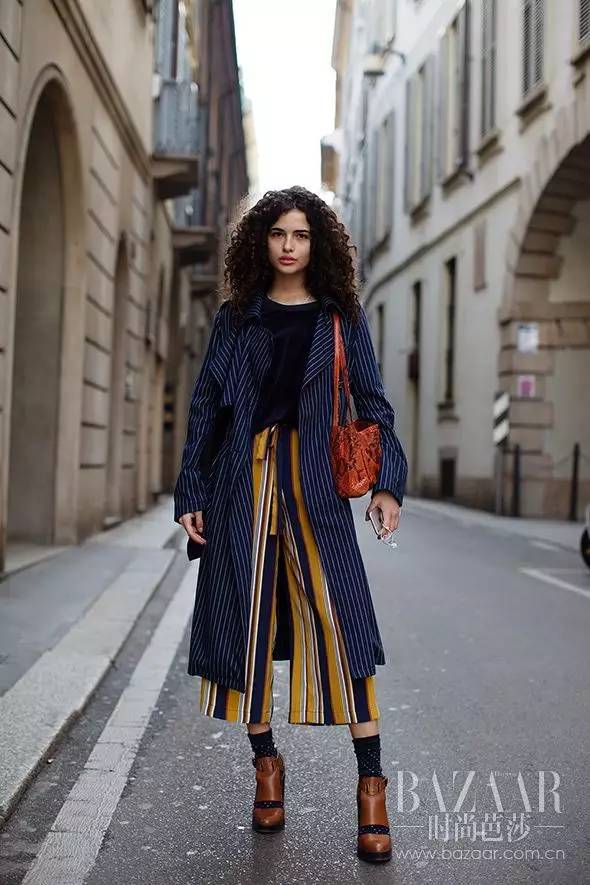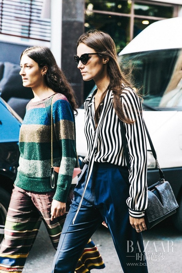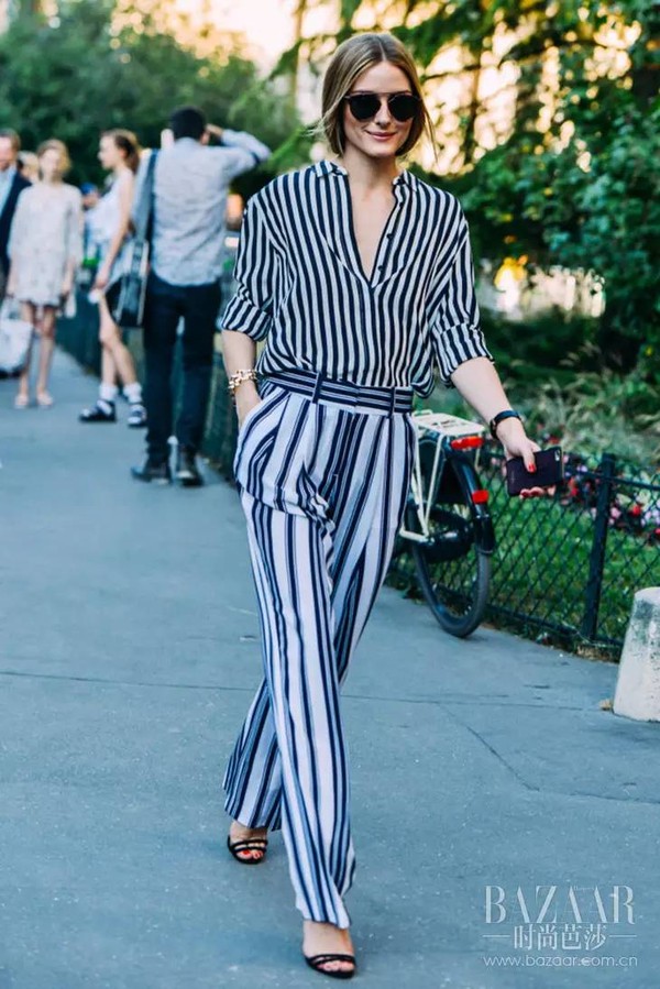 还有一种chic的搭配就是与细条纹来搭配,产生微妙的视觉对比效果,时髦随性!
