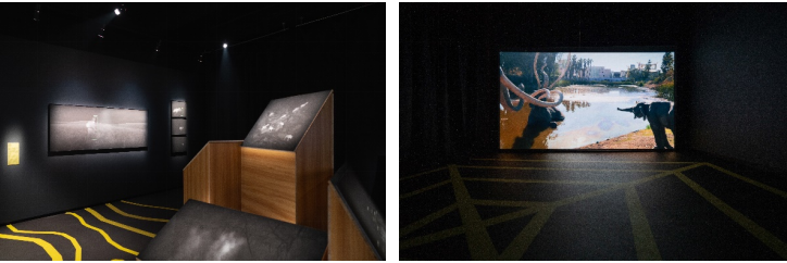 甘莹莹和周一辰携亚历克斯·特纳(Alex Turner)、王凝慧(Alice Wang ) 、顾桃(Gu Tao)、约瑟夫·科瓦奇(Josef Kovac)、玛格利·杜赞特(Magali Duzant)、宋兮(Song Xi)、徐维静(Vivian Xu)和尤里安·金塔纳斯·诺贝尔(Yurian Qunintanas Nobel)共8位艺术家的作品展出。“燃烧之路”的策展理念呈现于展厅地面的金色图案,一条由宏观至微观、由外至内的河流,将8位艺术家的作品以一种首尾衔接的方式串联,它从广阔的自然流经城市,行至人类的居所,穿越人的身体、皮肤,最终回归星辰大海,提出人类自身作为媒介连通技术与精神的可能性。