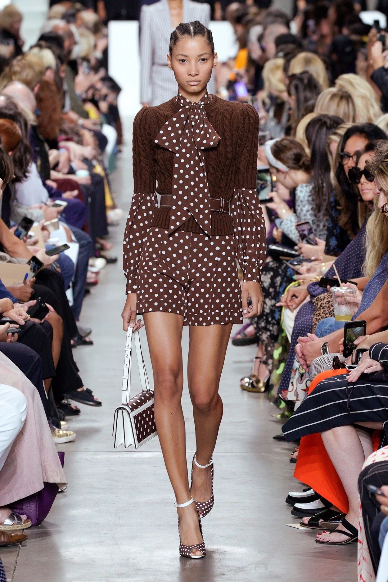 著名演员江一燕,此次也身着MICHAEL KORS COLLECTION 2019秋季系列棕色沙质印花连衣裙,黑色皮质腰带,持香槟色经典金属logo手包,搭配玫瑰暗金蛇纹高跟鞋,佩戴简约金色圆形耳环与戒指现身MICHAEL KORS COLLECTION 2020春季时装秀。充满质感的LOOK,也令江一燕原本就优雅大方的气质更加迷人。