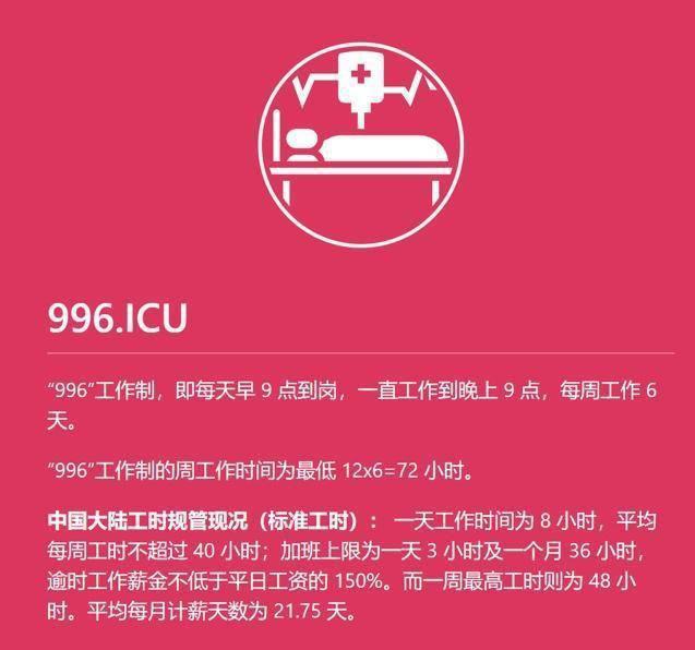 有技术人员在知名代码托管平台GitHub上发起了一个名为“996.ICU”的项目,以此抵制互联网公司的超时工作,并得到了大批程序员的响应(虽然并没有什么卵用)。