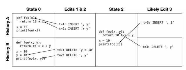 比如给出两个编辑序列(HistoryA和HistoryB)。经过两次编辑后,两个序列都有了相同的编码状态(State2),但HistoryA正在给foo函数添加一个额外的参数,HistoryB正在从foo函数中移除第二个参数。
